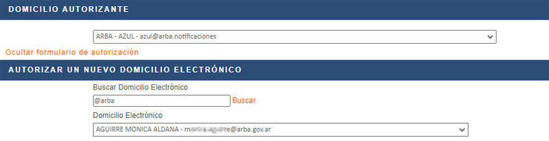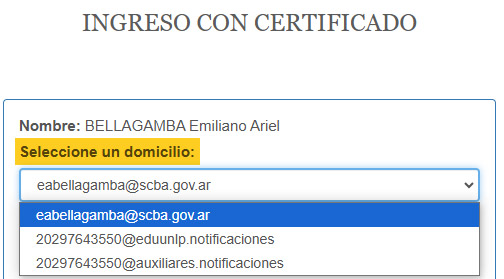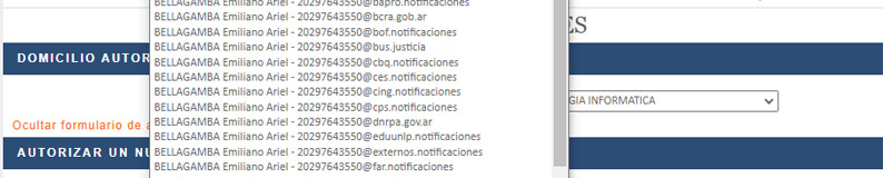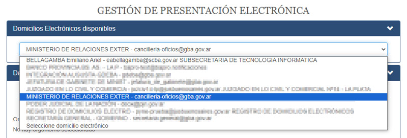 Para aquellas personas que son titulares o autorizadas de un domicilio electrónico de organismo (o más de uno), se les ofrece y deben seleccionar el domicilio con el que enviarán la presentación ("domicilio generador").