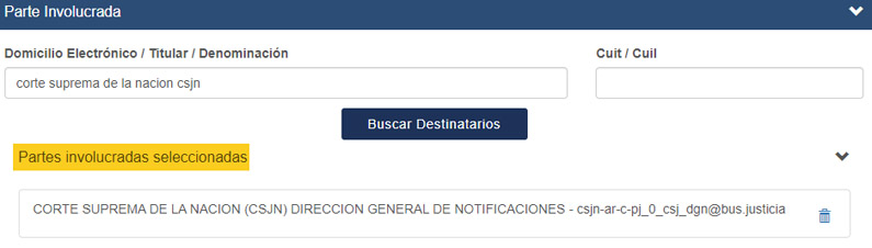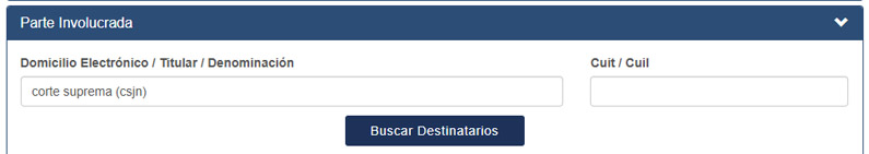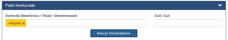 Se puede buscar el domicilio electrónico del destinatario por "Domicilio Electrónico/Titular/Denominación" o "CUIT/CUIL". No hace falta que se ingrese información en ambos campos para realizar la búsqueda.