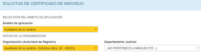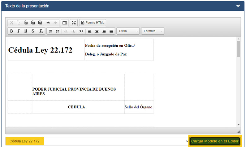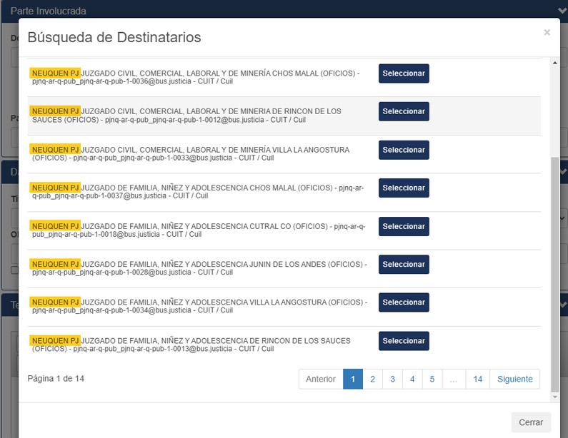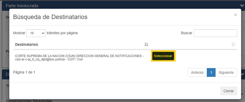 Aquí debe seleccionarse el organismo al que se le envía la presentación. Puede utilizarse el filtro de "departamentos judiciales" y el campo de texto para ingresar y realizar la búsqueda.