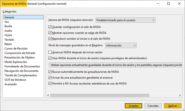 Haciendo clic en el ícono de NVDA podrá acceder a las “preferencias” y a las distintas opciones disponibles para configurarlo de la manera que mejor se adapte a sus necesidades.