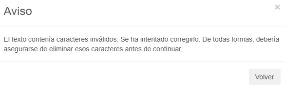Si al enviar una presentación, aparece el mensaje "El texto contenía caracteres inválidos. Se ha intentado corregirlo. De todas formas, debería asegurarse de eliminar esos caracteres antes de continuar", el portal de PyNE intenta corregir dicha situación para que reintente la firma y envío de la presentación.