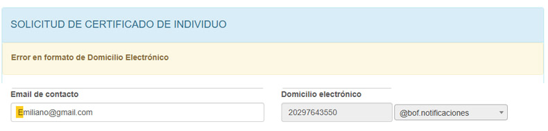 Esto se debe a que el mail de contacto en el formulario de "solicitud de domicilio electrónico de individuo" tiene uno o más caracteres en mayúsculas. Ingreselo todo en minúsculas y vuelva a intentarlo.