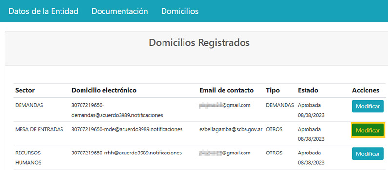 Al ingresar, tendrá disponible el o los domicilios registrados de la entidad. Debe hacer clic en "modificar" y desde allí puede cambiar el mail de contacto vinculado y/o la contraseña de acceso "sin certificado".