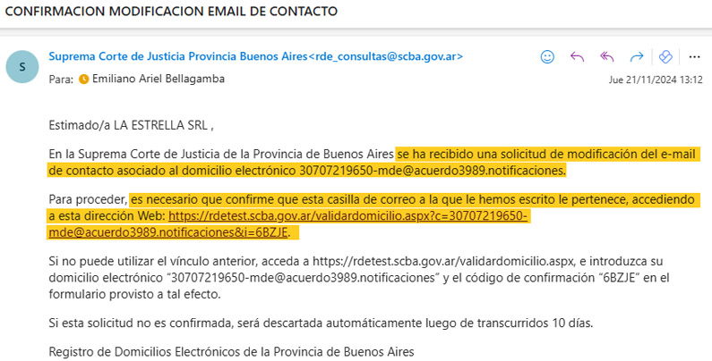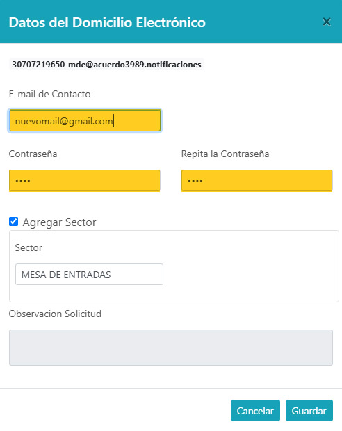 Si desea o necesita modificar el mail de contacto y/o la contraseña de un domicilio electrónico "@acuerdo3989.notificaciones" de persona humana o jurídica, debe gestionarlo el/la responsable de la entidad, ingresando al autogestionable del Registro de Domicilios Electrónicos