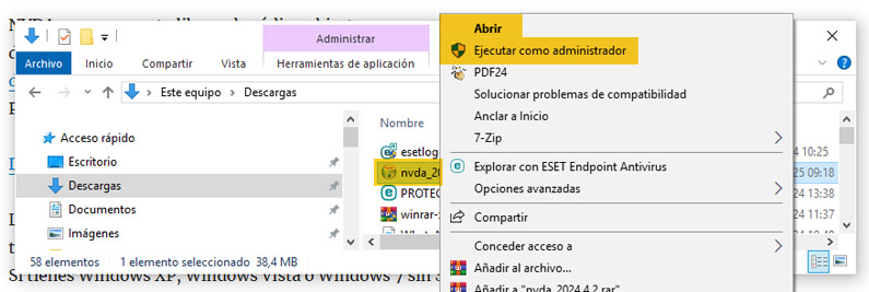 Si usted tiene Windows XP, Windows Vista o Windows 7 sin Service Pack 1, debe descargar “NVDA 2017.3”.