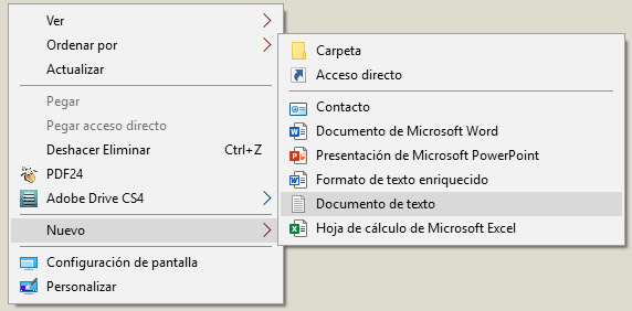 Para generar un documento de texto (bloc de notas), debe hacer clic derecho en el escritorio y en el menú contextual seleccionar "nuevo" y luego "documento de texto".