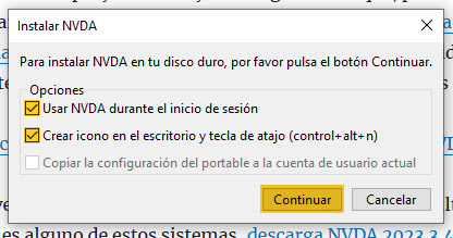 El proceso de instalación es accesible, es decir que NVDA comienza a leer la pantalla desde el inicio de la instalación.