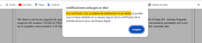 Si usted recibe ese mensaje, es probable que deba instalar o reinstalar los certificados raíz de la SCBA y/o la AC-ONTI. Para ello vea instalación de certificado raíz de la SCBA y/o instalación de los certificados raíz de la AC-ONTI