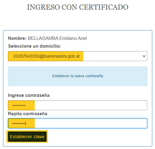 En el primer ingreso con certificado, el sistema ofrece que se establezca la contraseña. Deberá ingresarse, repetirse y "establecer clave".