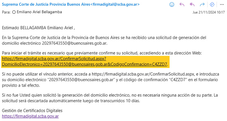 Su formato es "cuil@externos.notificaciones" y para solicitarlo debe contar con un certificado de firma digital de la AC-ONTI.