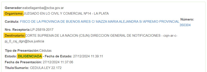 Desde aquí se puede agregar como destinatario de una presentación a una persona u organismo/entidad (deben tener domicilio electrónico). Para que culmine correctamente el circuito, el organismo que recibe la presentación (aquí cambia su estado de "pendiente" a "recibida") debe notificarla a dichos destinatarios (persona, entidad u organismo), quedando así la presentación en estado "diligenciada".